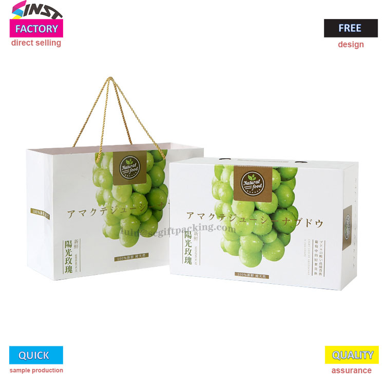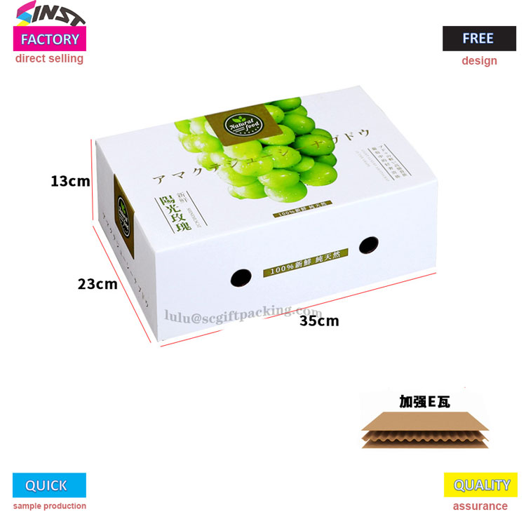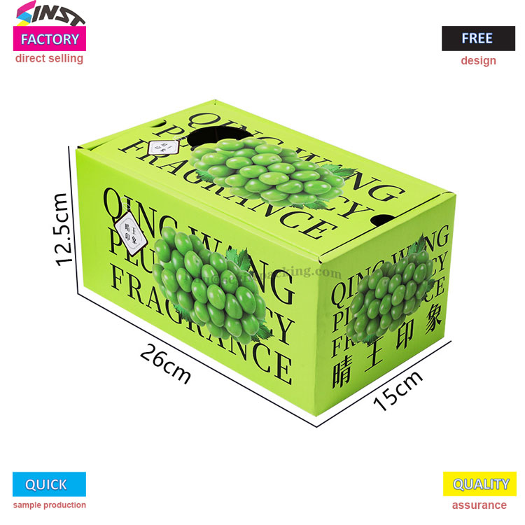 De fruituniversale handgeschenkdoos voor druiven is gemaakt van versterkt E-gecorrigeerd kartonnen materiaal, met een helder druivenpatroon gedrukt op het oppervlak. Het is gekoppeld aan een groene draagriem bovenaan en het merklogo dat op de dooslichaam wordt gedrukt, die duidelijk onze kernservicefilosofie overbrengt - geen tussenpersonen nodig om prijsverschillen te maken, en het hele proces van selectie tot massaproductie wordt beheerd door de fabriek.