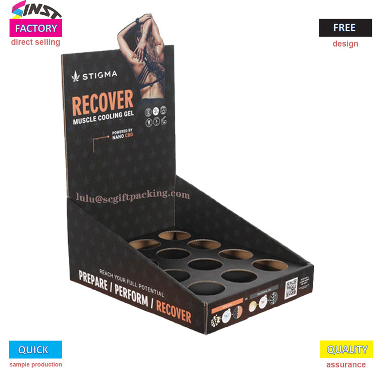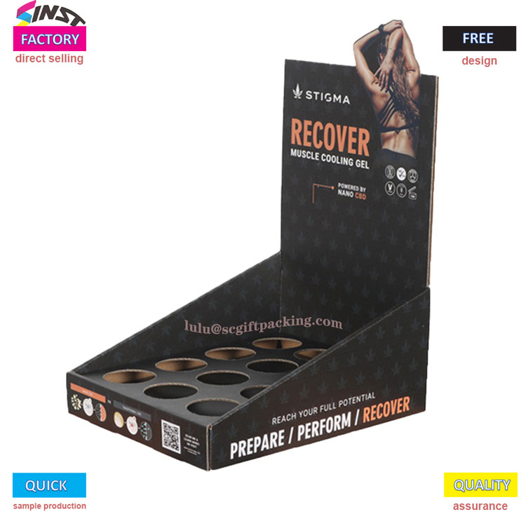 Dit display -doos van gezondheidsproduct met leeg ruimtepapier heeft een minimalistische esthetiek met zwarte achtergrond heet stempelen en een krachtig visueel effect, wat het kernverkooppunt van spierontspanning benadrukt na het sporten. Het displayrek neemt een multi -roostercirculair gatopslagontwerp aan, dat niet alleen het display stabiliseert, maar ook de textuur van de producten vrijgeeft,