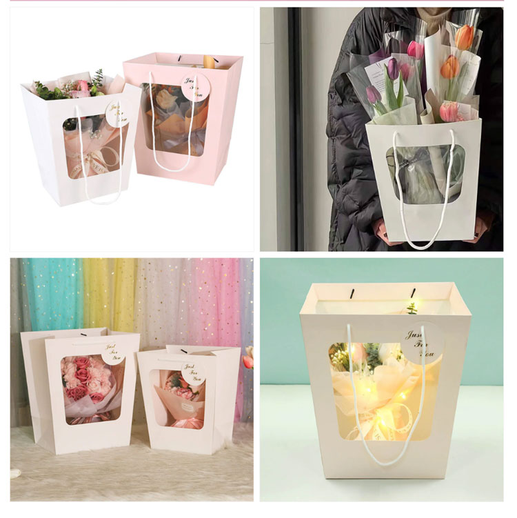 Windowbouquet Tote -tas. Geschenktassen zijn containers die worden gebruikt voor het opslaan en verpakken van geschenken. De belangrijkste materialen omvatten niet-geweven stof, papier, katoenen canvas, polyester katoenen canvas, enz. Vanwege milieuoverwegingen is de recyclebare aard van papieren verpakkingszakken een nieuwe favoriet geworden in de verpakkingsindustrie. Window Bounce Tote -tas verwijst naar het openen van een venster in het verpakkingsgebied en het afdichten met transparante PVC om het beste deel van het product weer te geven. Deze ontwerpvorm kan de authenticiteit en transparantie van het product verbeteren, waardoor consumenten een duidelijk begrip van het product zelf kunnen hebben en ook het vertrouwen van het product zelf weerspiegelen.