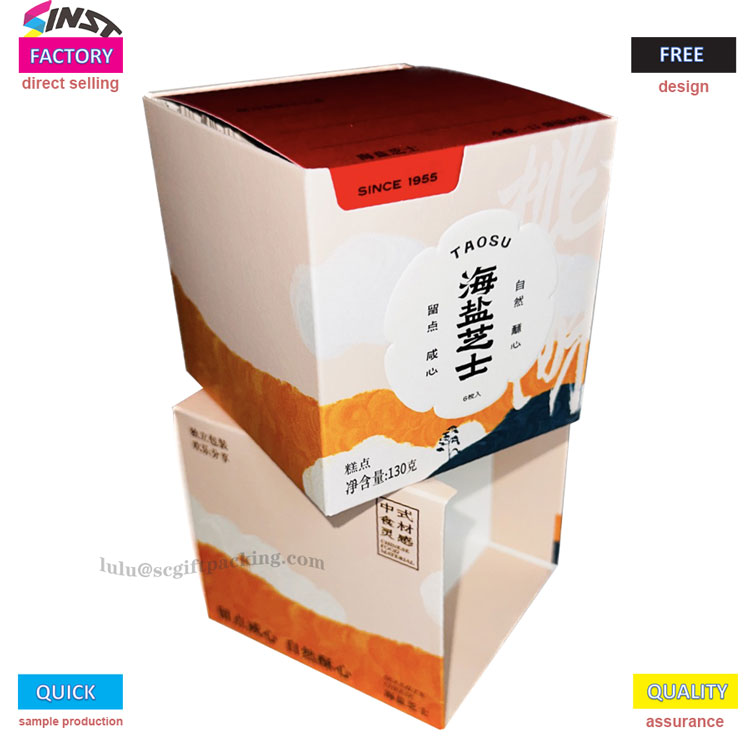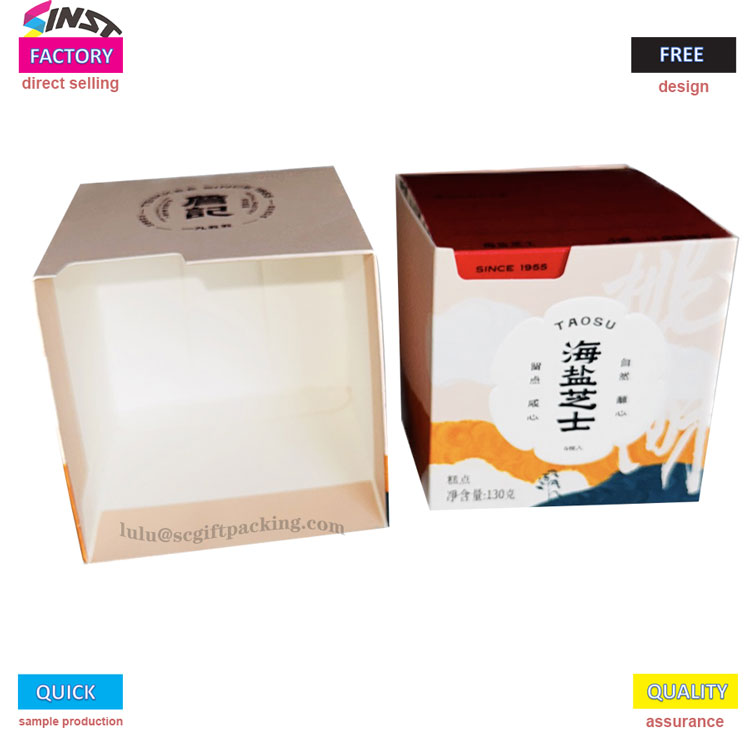 Samengesteld uit een doosafdekking en een doosbodem, bedekt de doosafdekking de onderkant van de doos. Deze structuur is eenvoudig en elegant, gemakkelijk te openen en te sluiten, en geschikt voor het verpakken van regelmatige gebakjes zoals vierkante en cirkelvormige gebakjes.
