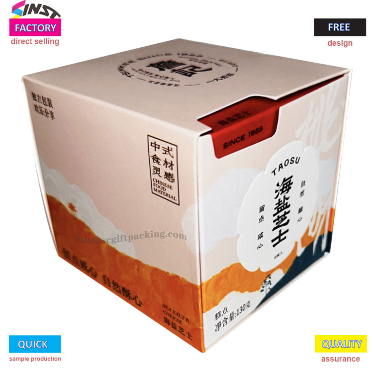 De pakketdoos van de zeezoutkaas is prachtig ontworpen en praktisch. Het maakt gebruik van hoogwaardige milieuvriendelijke materialen, die veilig en niet giftig zijn. De doosstructuur is stabiel en kan de gebak effectief beschermen tegen compressie. De uiterlijkstijl is divers, die kan voldoen aan de verpakkingsbehoeften van verschillende gebakjes.