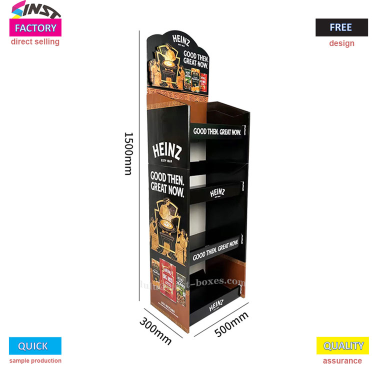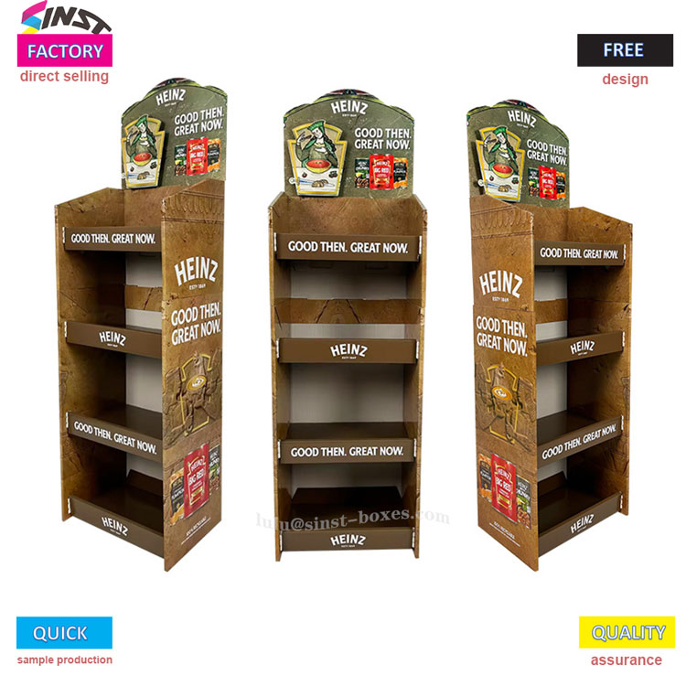Dit tomatensaus-displayrek is een "kleine hulp" voor supermarkten en gemakswinkels om saus uit te stallen. Het behoort tot een soort sausdisplayrek, gemaakt van kartonnen papieren displayrek, dat licht van gewicht is en gemakkelijk mee te nemen. Zodra het wordt uitgepakt en op het aanrecht wordt geplaatst, kan het worden gebruikt. De plank is verdeeld in vier lagen, elke laag kan twee rijen tomatensausflessen bevatten, en er kan ook wat saladedressing en zoete en pittige saus naast worden gevuld - het wordt een "tomatensaus-displayplank" genoemd, maar kan ook als sausplank worden gebruikt. Het is geschikt om hem in de kruidenruimte van een kleine supermarkt te plaatsen.